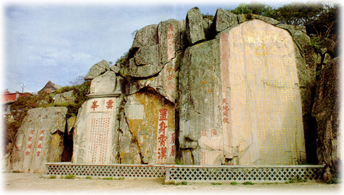 大观峰位于玉皇顶前、平顶峰下、盘路东侧,大观峰最有名处,是其削崖为碑,其上布满了历代题刻。最著名的是唐玄宗于开元十三年( 725 年)登封泰山时御制御书的《纪泰山铭》,俗称“唐摩崖”。碑高13.3米,宽5.7米,全文1008个字,明代王世贞评介:“穹崖造天铭书,若鸾飞凤舞于烟云之表,为之色飞。”西侧山峰常有云雾缭绕,因此名为“云峰”。峰上现有康熙帝题“云峰”,下有乾隆帝诗刻《夜宿岱顶作》。 大观峰和云峰上遍布题刻,唐刘仁愿、宋赵明诚、元徐世隆、明朱衡、清阮元及施闰章等历代名流题刻历历在目。 “置身霄汉”、“青碧丹崖”“天日苍茫”、“呼吸宇宙”等大字与《纪泰山铭》互为辉映,令人叹为观止。 大观峰前原建有东岳庙,乾隆题额“资始惟元”、“上摩苍昊”。惜民国年间被毁,现仅存台基和清咸丰年间重修碑。 唐摩崖在玉皇顶盘路东侧,大观峰削崖为碑布满了历代题勒,其中最著名的是唐玄宗于开元十三年(725年)登封泰山时御制御书的《纪泰山铭》,俗称“唐摩崖”。摩崖高12.3米,宽5.3米。碑文24行,每行51字,现存1008字(包括题"纪泰山铭"和"御撰御书"等字)。除"御撰御书"4字和末行年、月、日为正书外,其他均为隶书,字大25厘米,额高3.95米。隶书"纪泰山铭"2行4字,字大45×56厘米。唐摩崖"纪泰山铭"刻石,形制端正,气势雄伟,后人题"天下大观"四字于其上部,因而此峰又称大观峰。唐摩崖书法遒劲婉润,端严浑厚。碑文为唐玄宗李隆基东封泰山时所撰书,记述了封禅告祭之始末,申明封禅的目的是为苍生祈福,铭赞高祖、太宗、高宗等先皇之功绩,表明自己宝行三德(慈、俭、谦)之诺言。因长期遭受风雨剥蚀和人为破坏,铭文现已残26字,不可辩认的6字。周围还有宋摩崖、清摩崖及明清刻石75处。