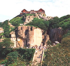 玉皇顶是泰山主峰最高处,因建有玉皇庙故名。 玉皇庙古称太清宫、玉帝观,始建年代无考,明成化年间重修。由山门、玉皇殿、观日亭、望河亭、东西道房组成。 正殿内祀玉皇大帝铜像。神龛上匾额题“柴望遗风”,说明远古帝王曾于此燔柴祭天,望 祀山川诸神。正殿前有“极顶石”,标志着泰山的最高点,1921年增修石栏时王钧题“极顶”。 极顶石西北侧有“古登封台”碑刻,说明这里是历代帝王登封泰山时的设坛祭天之处。 东面的观日亭可望“旭日东升”,西面的望河亭可观“黄河金带”。 庙前有 无字碑,据传为秦始皇封禅立石或为汉武帝立石,又传碑内封藏金简玉函,故又称石函。 玉 皇顶前盘道两侧有“五岳独尊”等著名题刻。 东南宽敞的石坪名为平顶峰,清康 熙二十三年(1684年)建乾坤亭,上刻“孔子小天下处”。亭毁于民国年间,碣毁于1967年。 西南为青帝宫,由山门、大殿、东西配殿组成。再向西为后寝宫,又称神憩宫,有正殿、配殿,祀木雕元君卧像 ,民国年间毁。两宫建于明,重修于清。宫西有三星神憩宾馆。