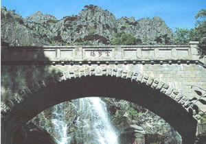 云步桥位于“斩云剑”北侧,在快活三里北首。是跨中溪而建的一座单孔拱形石桥。 桥北有大片高崖,上有飞瀑下泻,名为飞瀑河、又称天河。此处谷深林茂,常有云雾缭绕,加之瀑布飞溅,生云化雾,人行桥上,宛在天际,故名“云步桥”。明代陈凤梧有诗:“百丈崖高锁云烟,半空垂下玉龙涎。天晴六月常飞雨,风静三更自奏弦。苍水佩悬云片片,珠帘洞织月娟娟。晚山倒着肩舆下,回看斜阳景更艳”。 高崖之上石坪坦豁,据传宋神宗来泰山曾在此坪驻跸,有柱窝遗迹为证,因称御帐坪。 桥东有酌泉亭,又名观瀑亭,清末泰安知县毛澂建。北侧有联:“且依石栏观飞瀑,再渡云桥访爵松”。